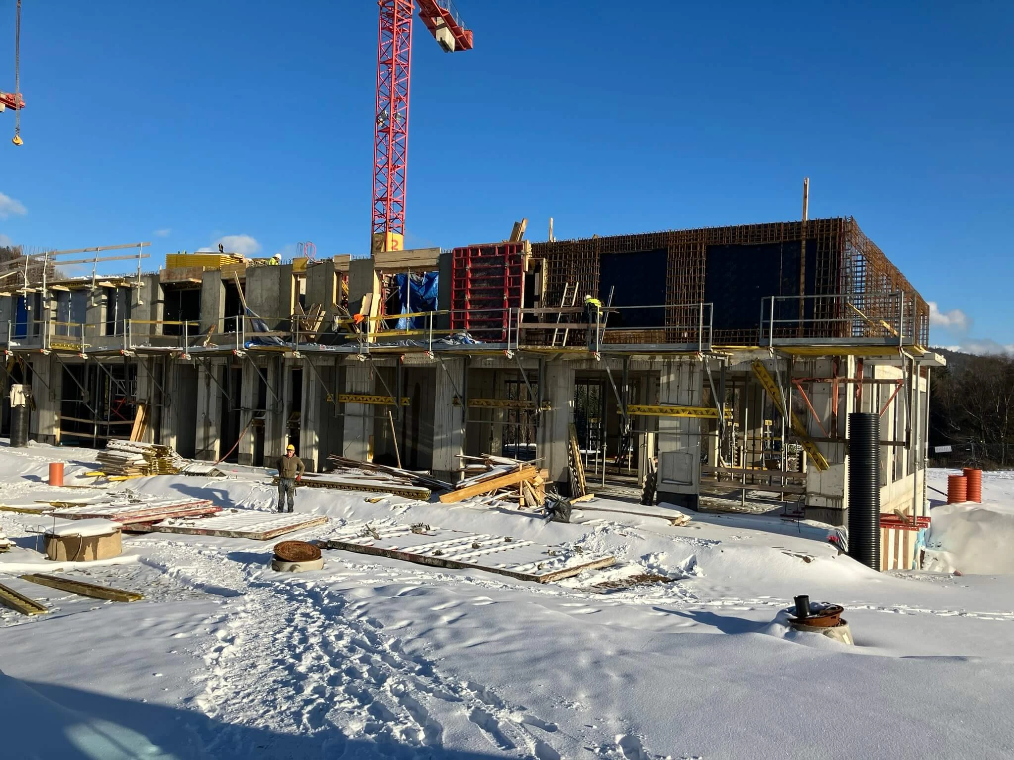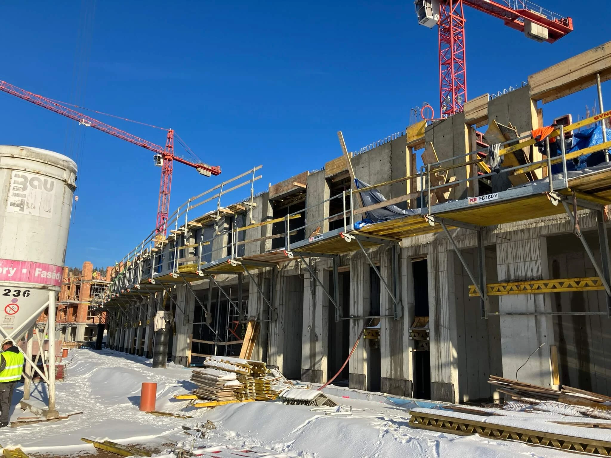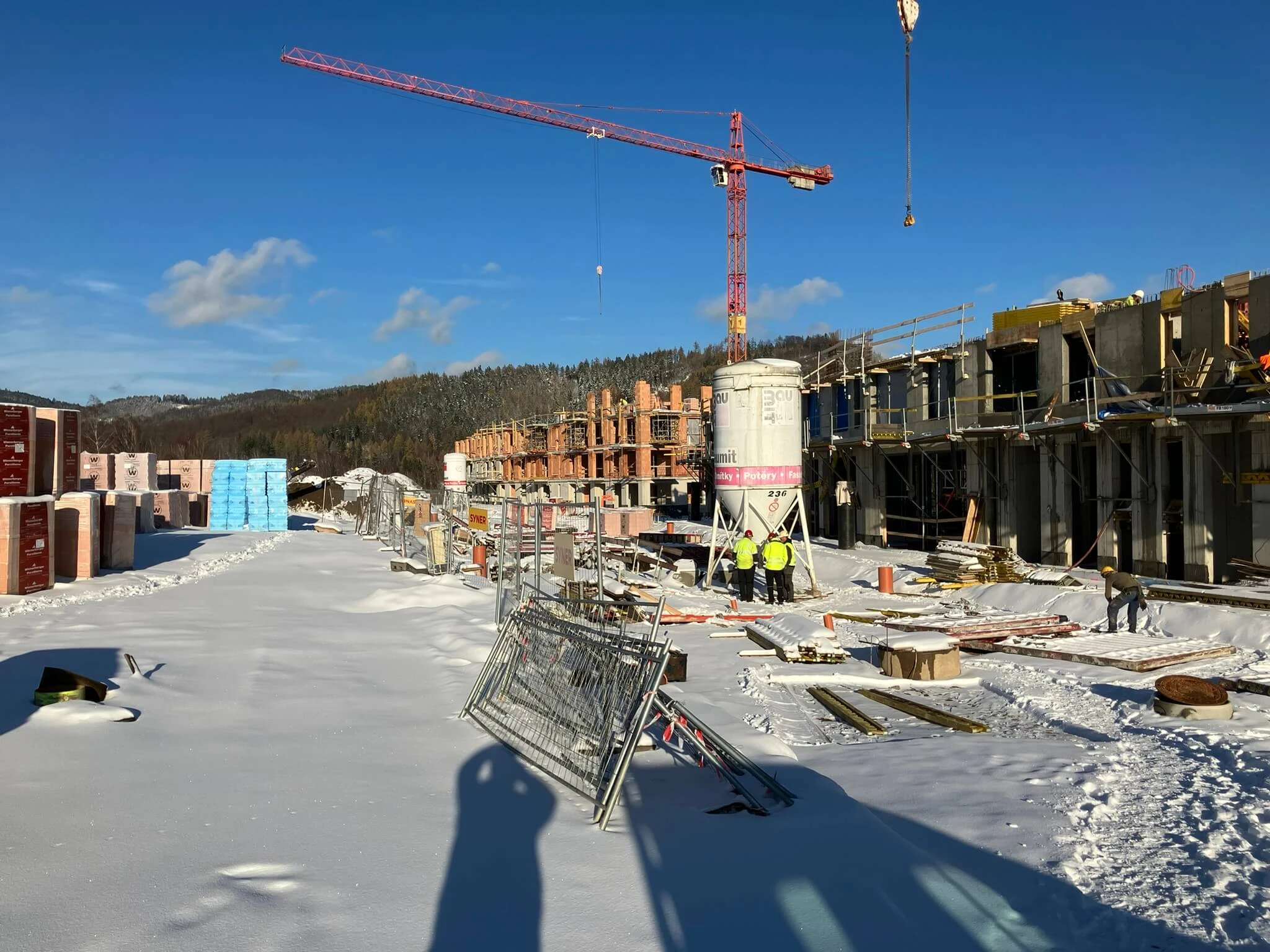 Je mrazivé lednové ráno a na stavbě Nové Kunratické panuje čilý pracovní ruch. Jeřáb právě usazuje poslední betonový panel stropní konstrukce jednoho z domů, zatímco skupina dělníků dole pečlivě připravuje armatury pro další část stavby. Všude je slyšet zvuk míchaček a cvrkot nářadí.